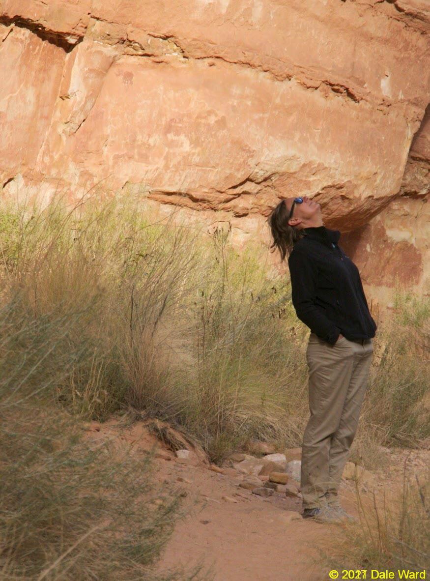 Laurie looking up at the overhanging canyon wall, Capitol Reef