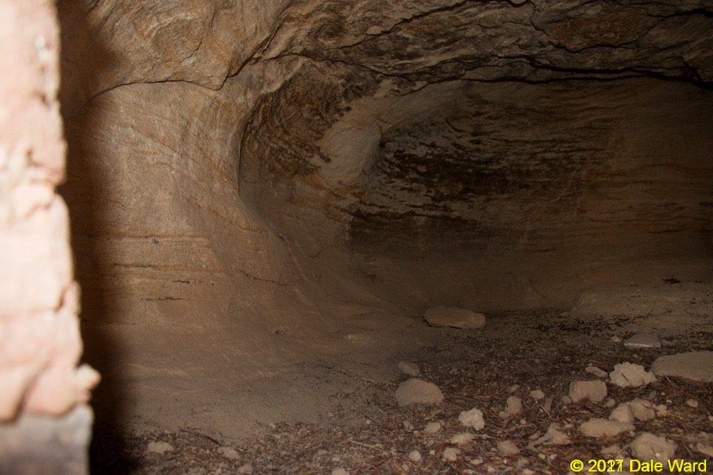 I peered in through the doorway, playing my flashlight over the interior. It was a single room, perhaps 20 feet by 20 feet. There was a what looked like bat guano on the dusty floor. The ceiling was probably four feet high, too low to stand. As I looked at the room in the light of the flashlight, it reminded me of a previous unfortunate incident I had had with caves, and I was glad that I had decided not to go in.