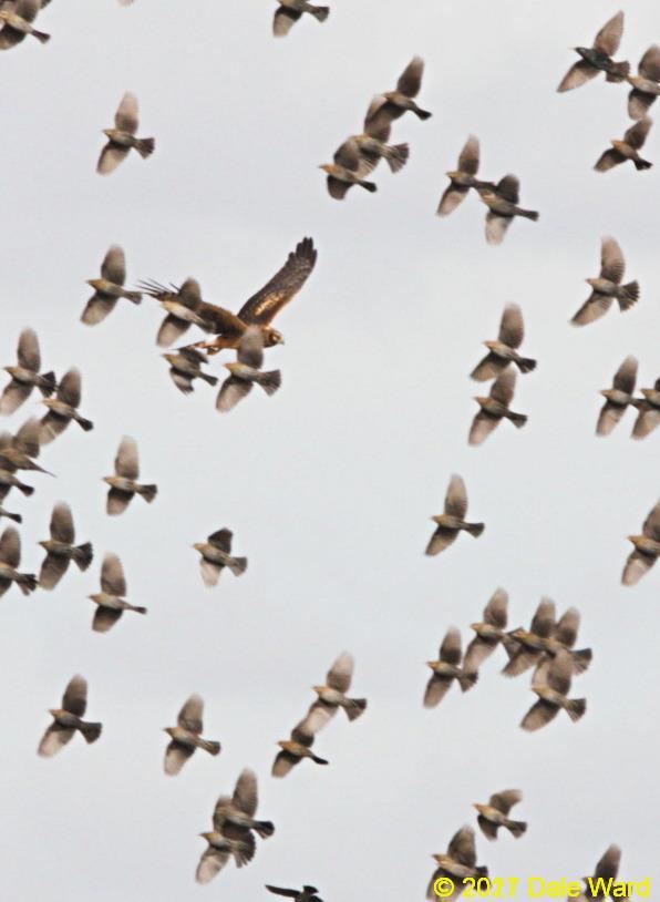The Harriers seemed to be very aware of each other as they hunted. One hawk’s dive would leave fragments of the large flock in its wake, and the next Hawk would dive at those clumps until the Blackbirds could merge back into the large, main Blackbird flock.