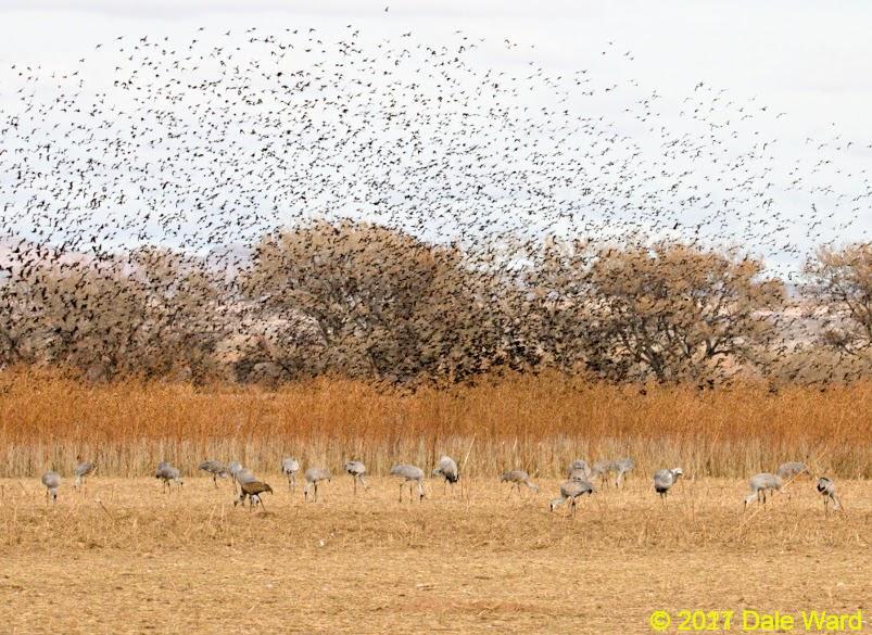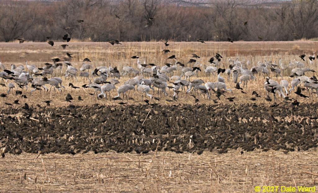 Flock of Redwinged Blackbirds, with Sandhill Cranes in the background.