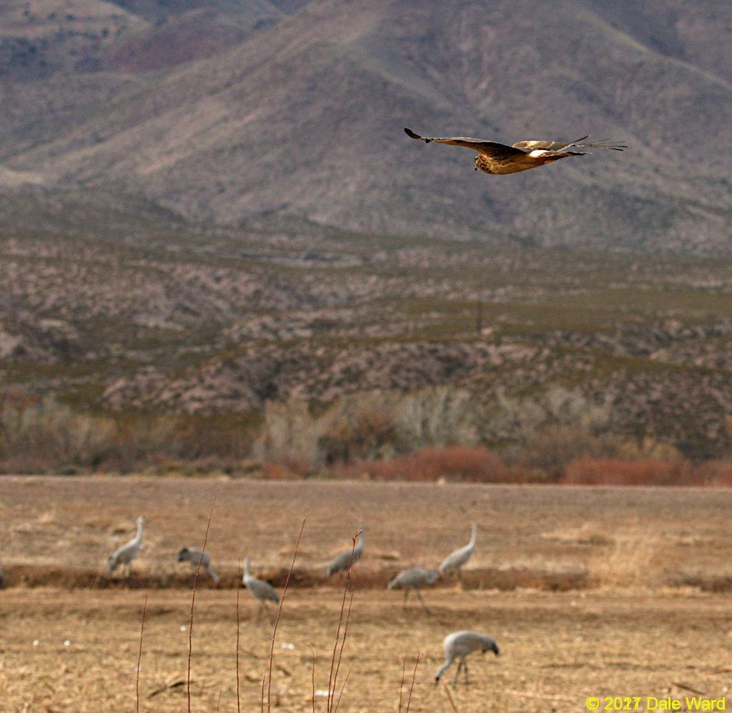 Northern Harrier cruising cut-over cornfield, above Sandhill Cranes.