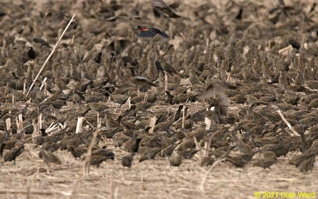 There were thousands of the Red-winged Blackbirds, and they formed numerous small flocks that were foraging in the dried sunflower stalks at the edges of the cornfields.