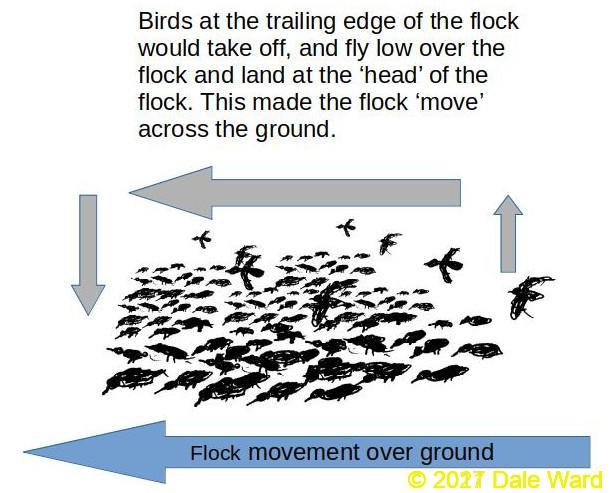 The birds that were at the trailing edge of the flock, though, would fly up and over the flock, then land at the ‘head’ of the flock. Since these birds moved in a consistent direction, the net effect was that the body of the flock crept across the cornfield.