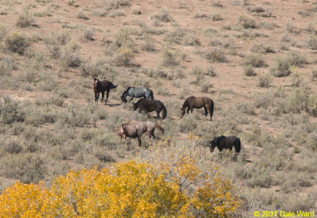 Mustangs on the other side of the canyon. There are about 15 or 16 in this band. The rocky ‘peninsula’ is running along the bottom edge of the photo. It divides the canyon bottom into two.