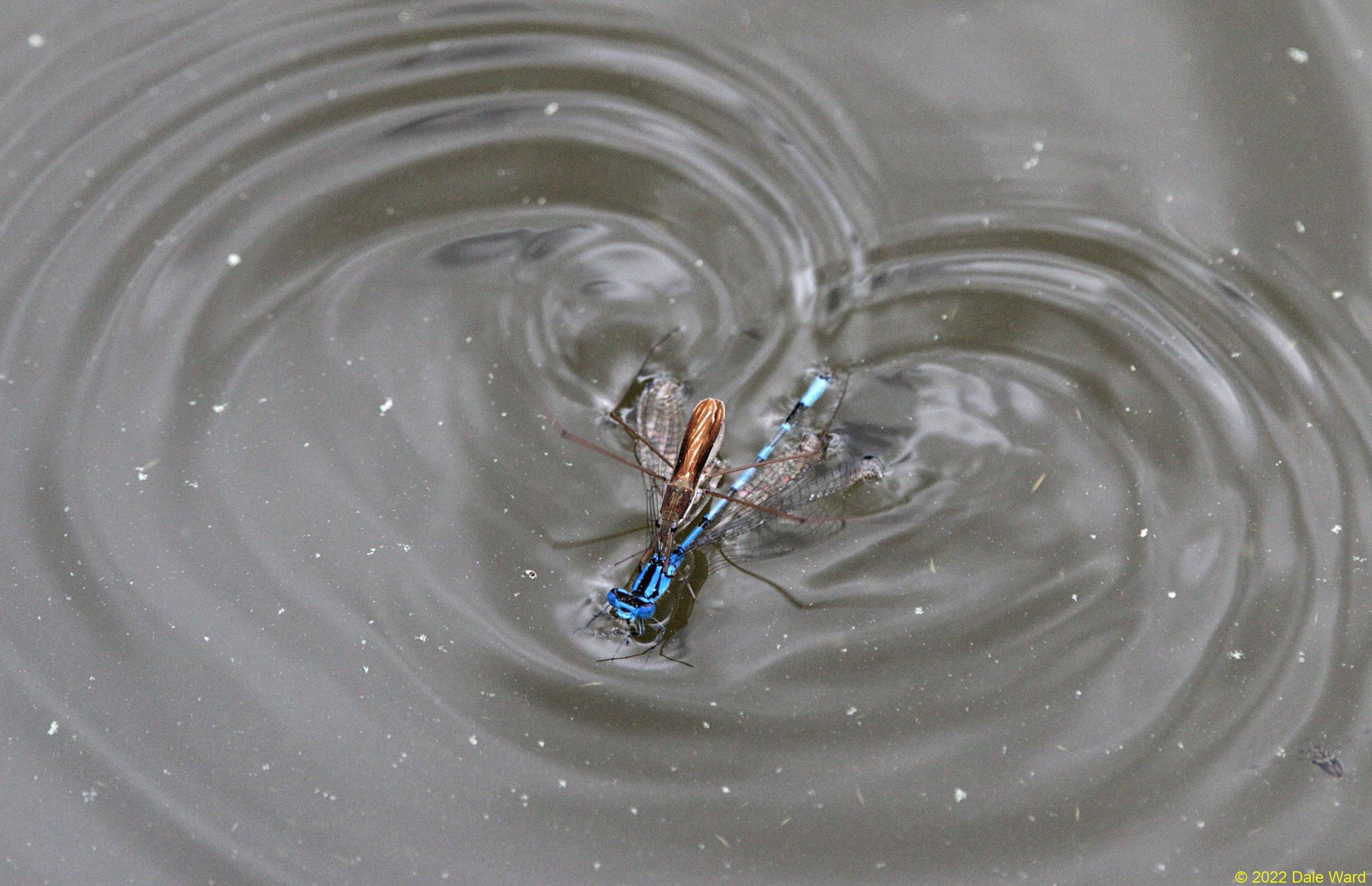 Water-strider with newly captured Damselfly. The struggles of the Damselfly have left heart-shaped waves in the water